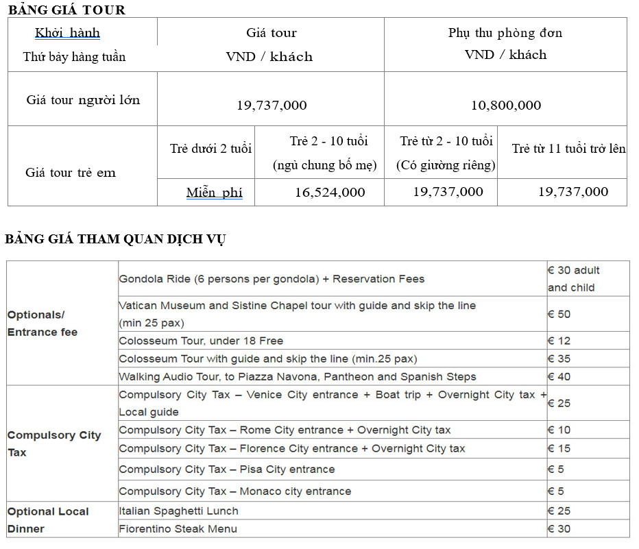 GIÁ TOUR - BẢNG GIÁ TOUR