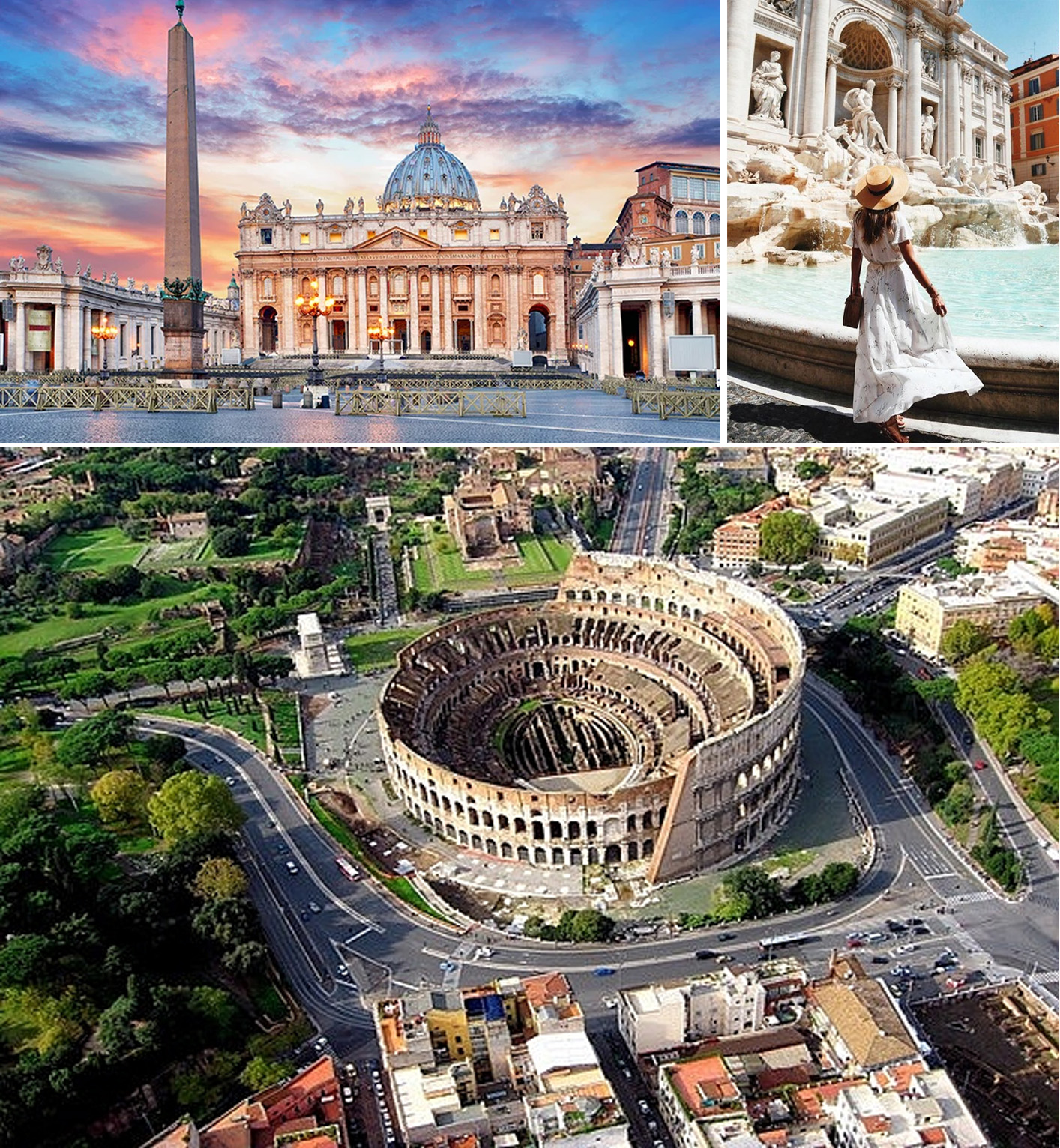 - Tiếp nối chuyến thăm quan, du khách sẽ đến thăm đài phun nước Trevi, một kiệt tác nghệ thuật Baroque, nơi du khách ném những đồng xu vào đài phun nước để cầu nguyện được trở lại thăm thành phố vĩnh hằng Rome một lần nữa. Sau bữa trưa, đoàn sẽ ghé thăm đấu trường La Mã Coliseum, được xây dựng vào thể kỷ đầu sau công nguyên. Du khách có thể lựa chọn tản bộ quanh khu vực đấu trường hoặc chọn một tour vào thăm quan bên trong đấu trường để có thể tưởng tượng một cách sinh động về những trận chiến của các đấu sĩ thời xưa.