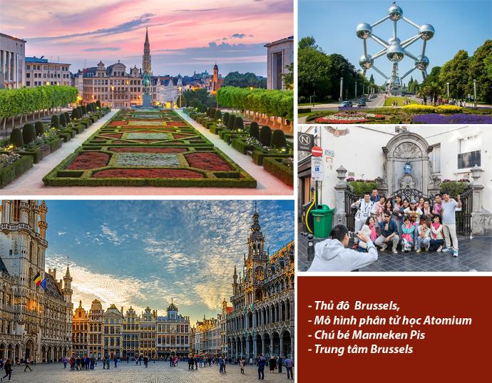 - Đi vào trung tâm Brussels , hướng dẫn viên sẽ dẫn du khách ghé thăm Quảng Trường lớn, chiêm ngưỡng bức tượng đồng Chú bé đứng tè Manneken Pis nổi tiếng. Sau đó du khách sẽ có một khoảng thời gian tự do để mua sắm, thường thức các đặc sản của Bỉ như là Sô-cô-la, bánh waffles.