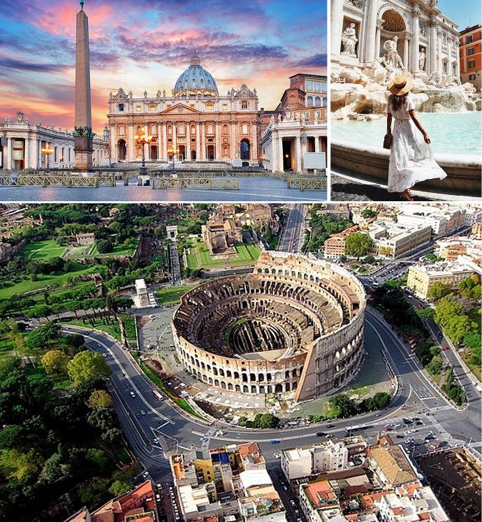 - Tiếp nối chuyến tham quan, du khách sẽ đến thăm đài phun nước Trevi, một kiệt tác nghệ thuật Baroque, nơi du khách ném những đồng xu vào đài phun nước để cầu nguyện được trở lại thăm thành phố vĩnh hằng Rome một lần nữa. Sau bữa trưa, đoàn sẽ ghé thăm đấu trường La Mã Colosseum, được xây dựng vào thể kỷ đầu sau công nguyên.